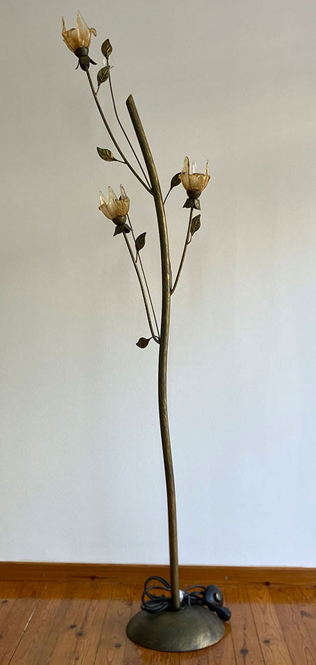 Three-light floor lamp with hand brown blown glass.